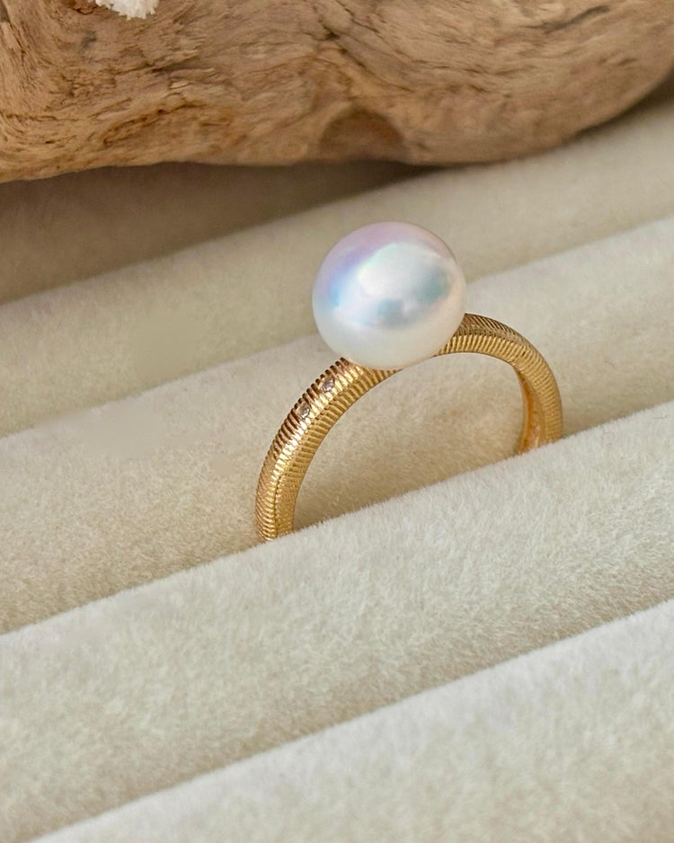 Está elaborado en plata de ley 925, con un baño de oro de 18 quilates. El aro del anillo presenta una delicada textura estriada con dos circonitas blancas engastadas en el aro, proporcionando un brillo extra que complementa el nácar de la perla.