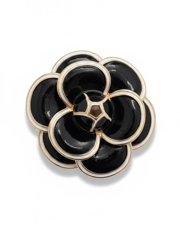 Realizado en metal dorado y esmaltado. Sus pétalos, delineados con finos bordes dorados, crean un juego de volúmenes.