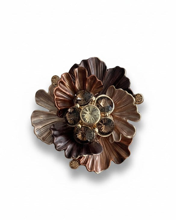 Su diseño multicapa en relieve aporta volumen y distinción a cualquier prenda. Los pétalos, en tonos marrón y bronce satinado, rodean un corazón de cristales en tonos ahumados. Pieza ideal para quienes buscan un accesorio con aire vintage.