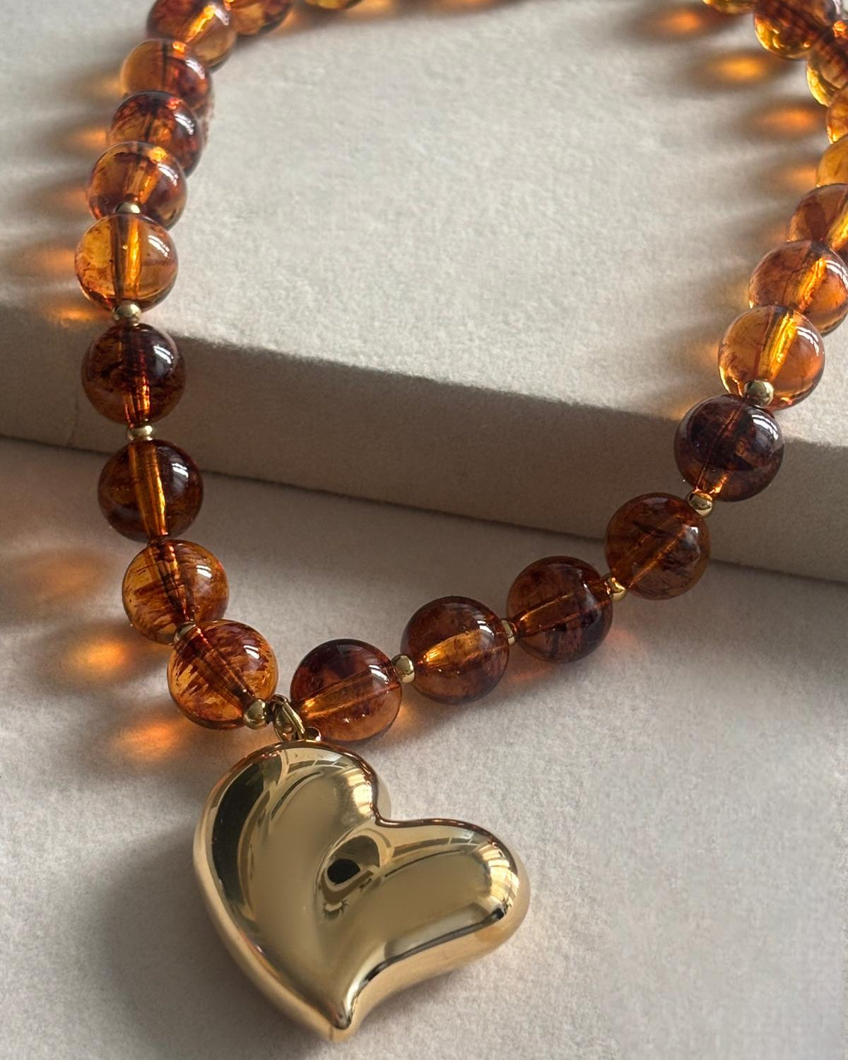 El collar ámbar está compuesto por cuentas esféricas de resina translúcidas. Como pieza protagonista, un maxi colgante en forma de corazón en acero hipoalergénico, efecto pulido.