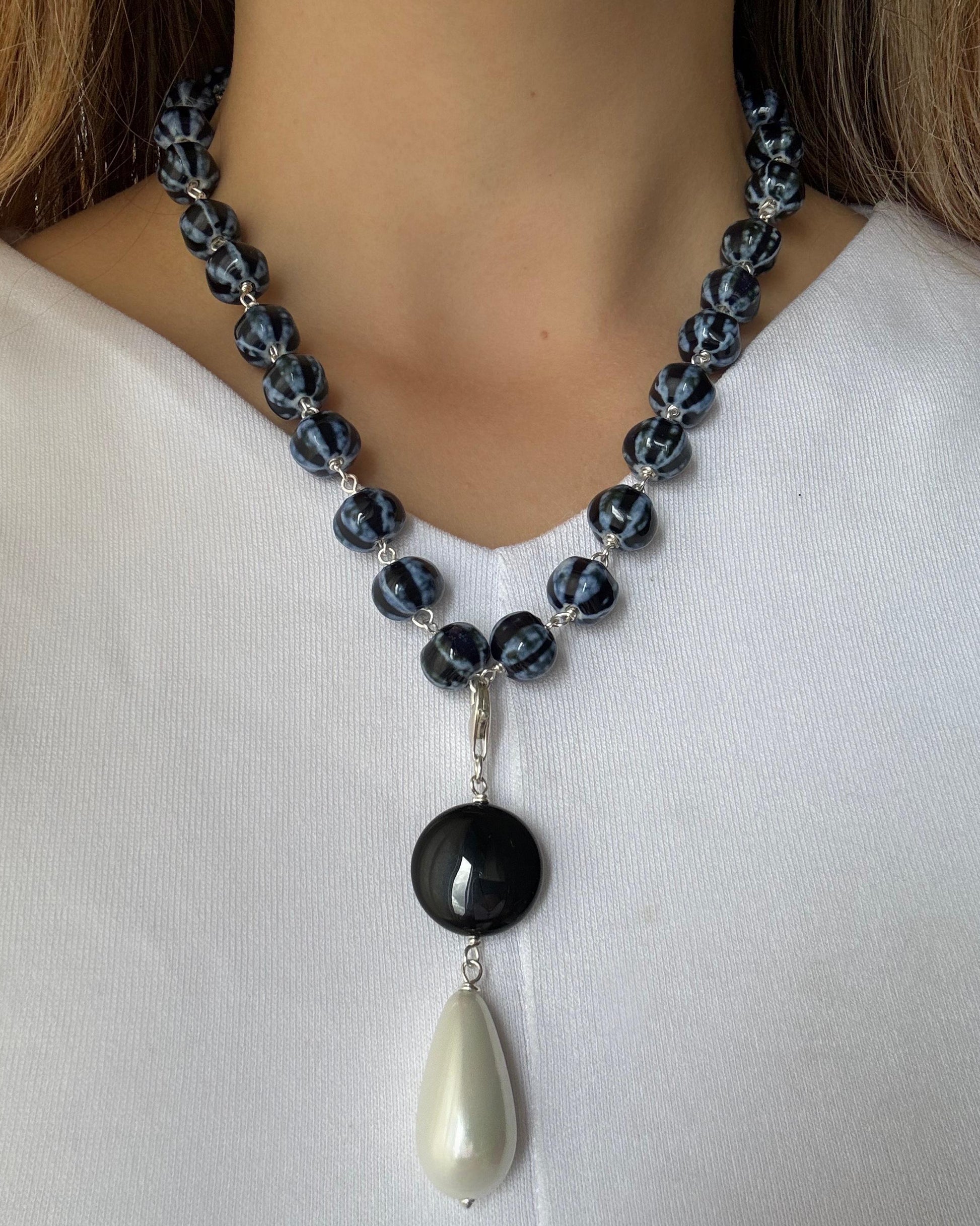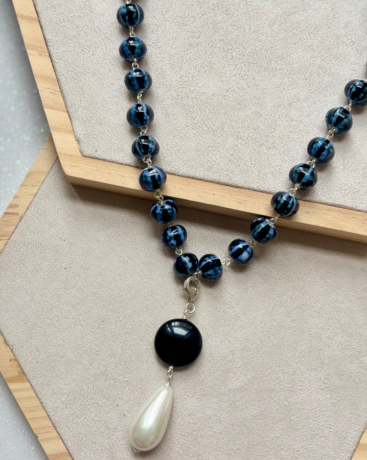 Nuestro collar Anochecer está hecho a mano con piedras de cerámica nacarada en tonalidad azul y negro. Su colgante está compuesto por una piedra de ónix negro, junto a una perla en forma de gota, aportando elegancia.