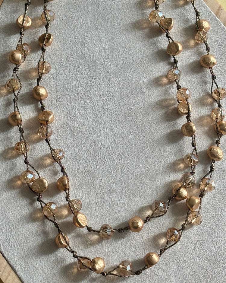 Su longitud está pensada para llevarlo en una o dos vueltas. La combinación de cuentas de cristal facetadas y mate están unidas con un cordón tejido.