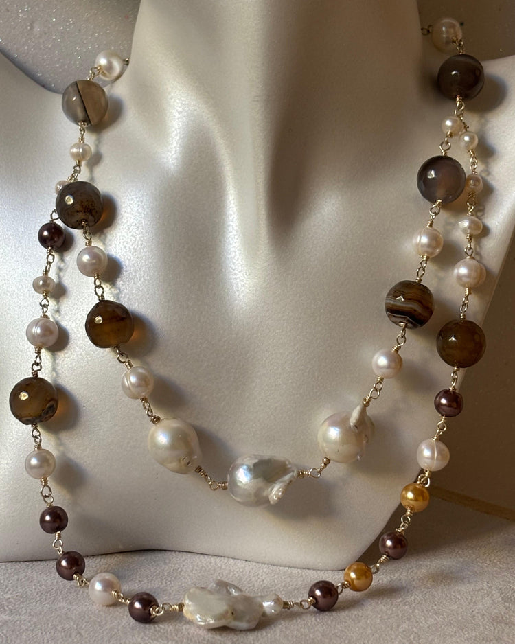 Nuestro collar Charlotte es una pieza exclusiva, elaborada con una cuidada selección de perlas cultivadas de río en diferentes tamaños, perlas japonesas y ágatas bandeadas en tono marrón.