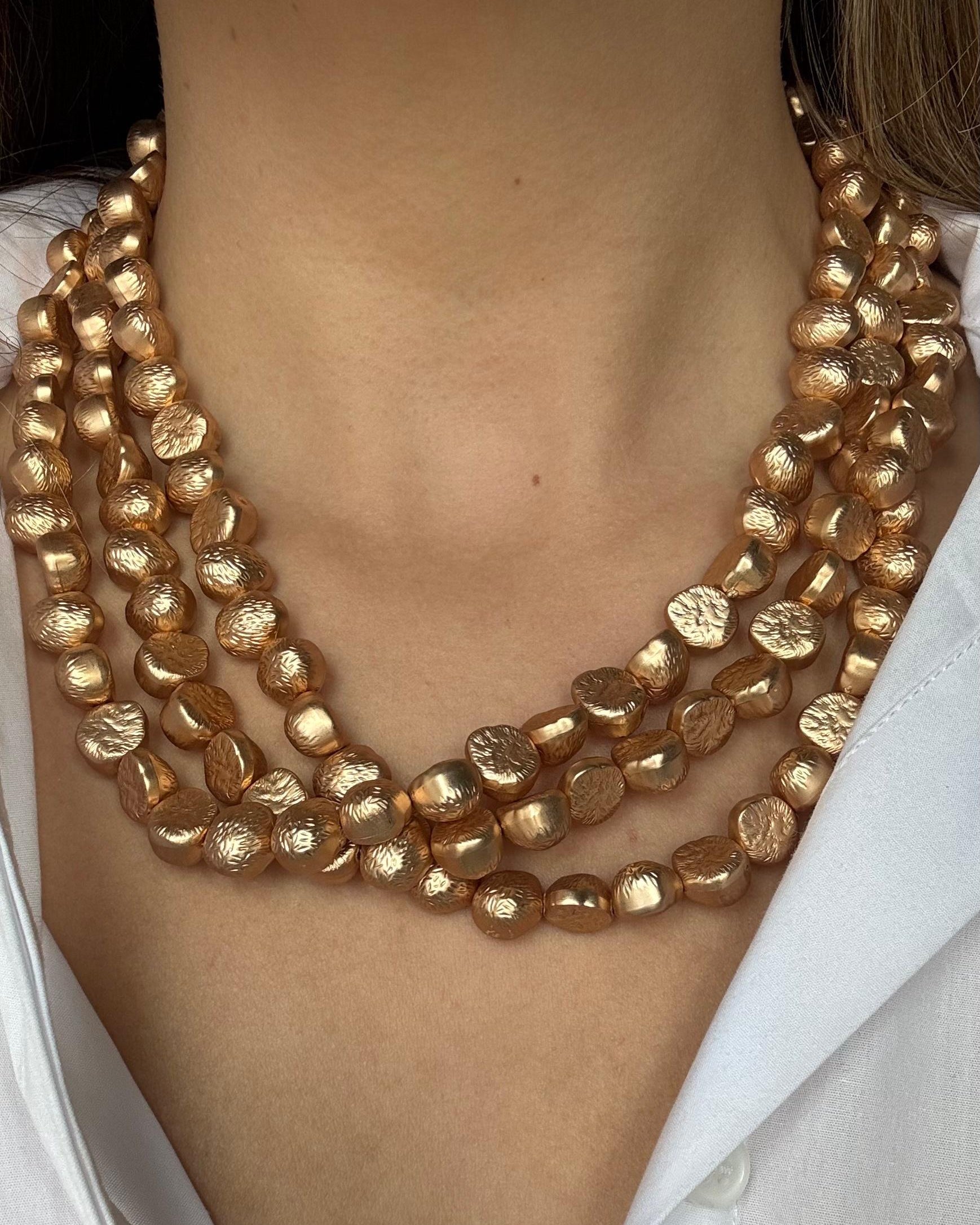Eleva tu estilo con nuestra gargantilla de tres hileras de cuentas. Cada una presenta un acabado texturizado y ligeramente irregular, que le aporta un aspecto orgánico y cómodo. Pieza elegante y atemporal.