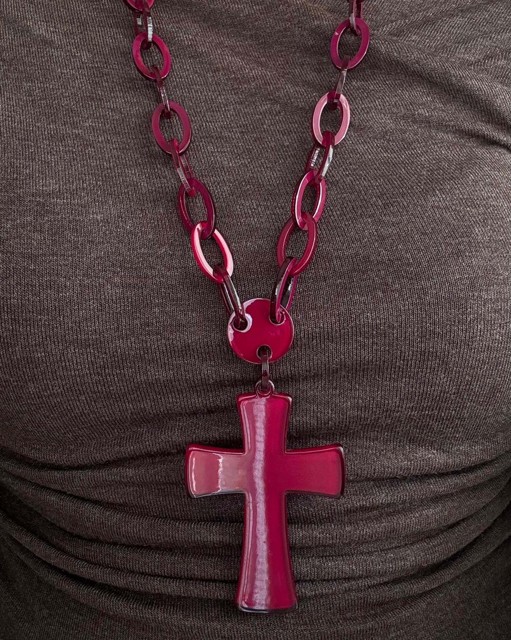 Añade un toque a tu look con este collar de tendencia. Diseñado con una cadena de eslabones de resina y un colgante en forma de cruz XL, es la pieza ideal para transformar un outfit básico.