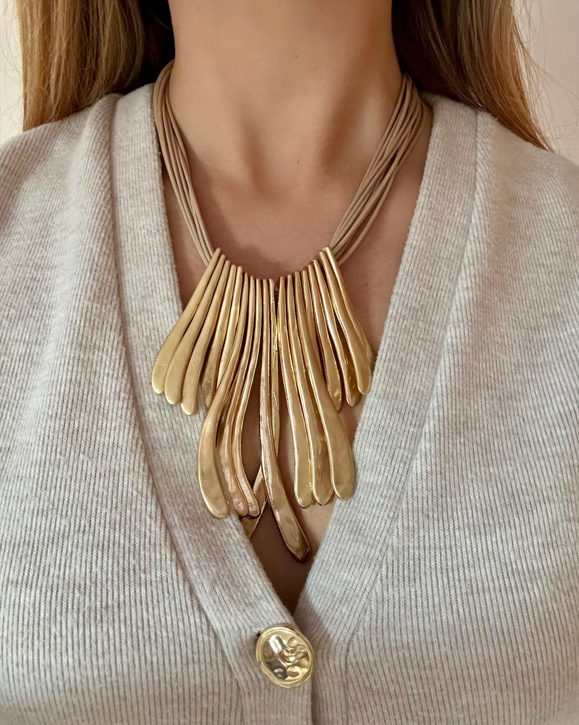 Nuestro collar Isis, es una pieza deslumbrante que combina elegancia y presencia. Está compuesto por láminas metálicas doradas que caen en cascada, capturando la luz con un brillo intenso. Cada pieza se sostiene sobre una cuerda textil en color beige.