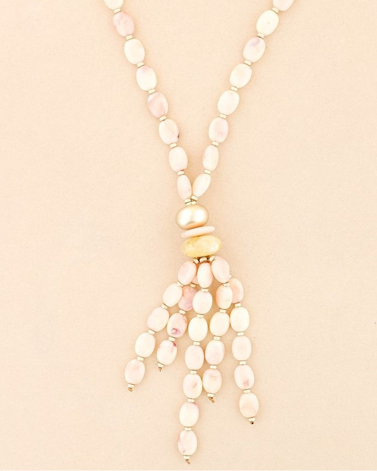 Destaca por su pieza central dorada, que recoge las hileras de cuentas de resina en color rosa veteado, dejando que caigan con movimiento y ligereza.
