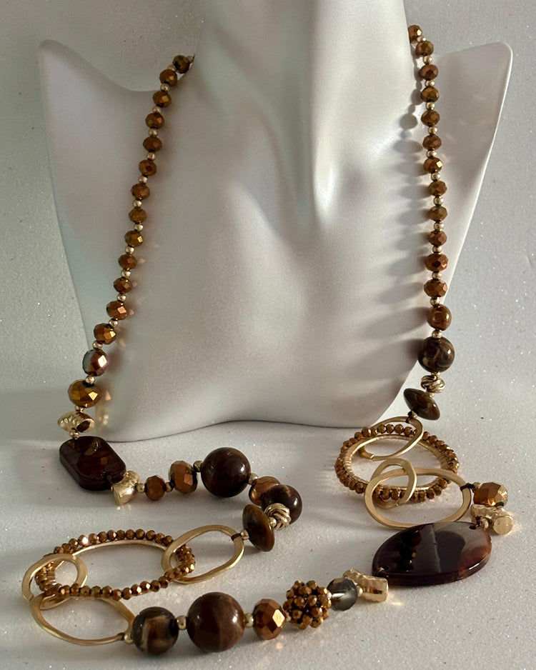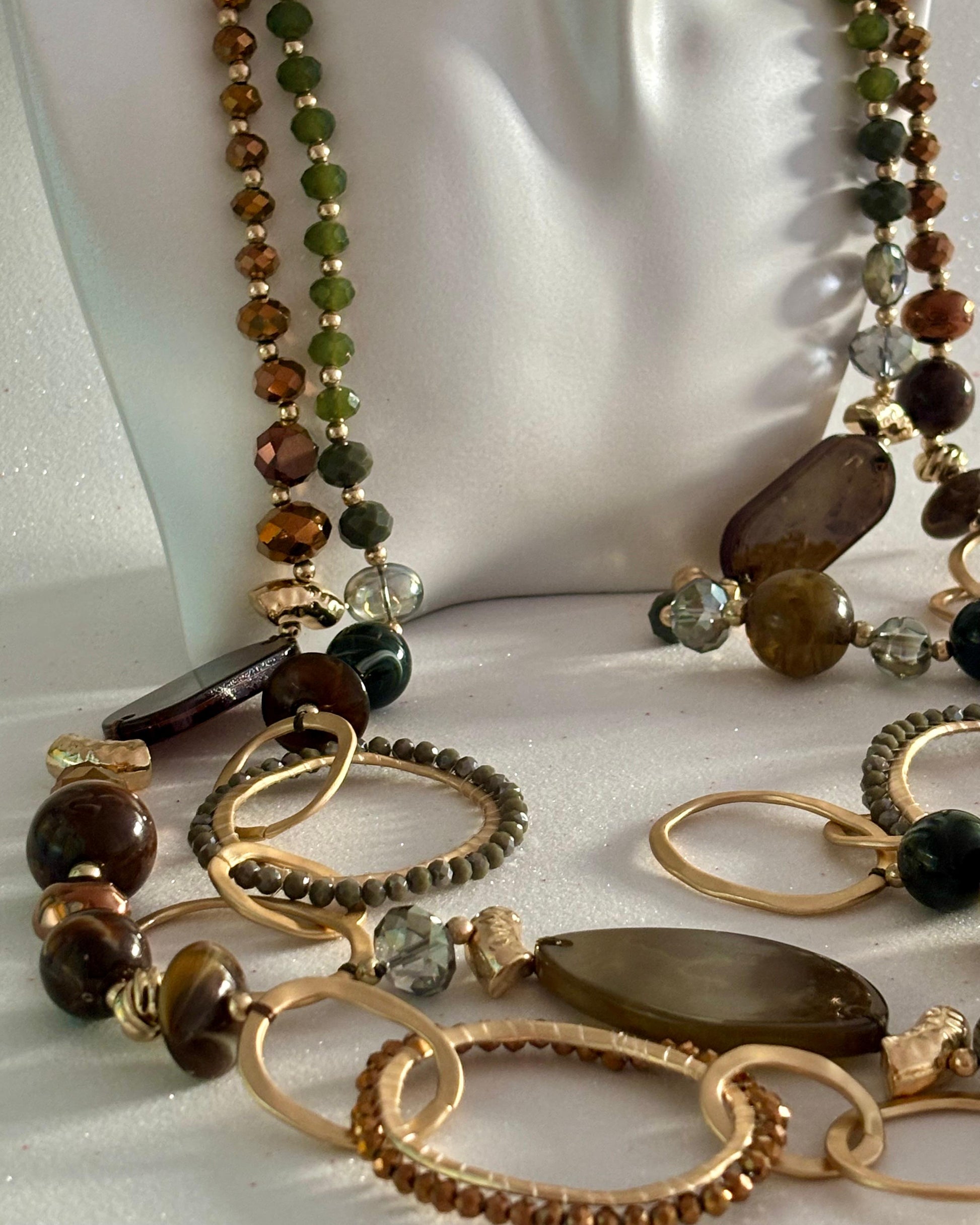 Descubre nuestro collar Savanna, disponible en color marrón y en verde bosque. Está diseñado con cuentas irregulares con toques dorados y aros metálicos.