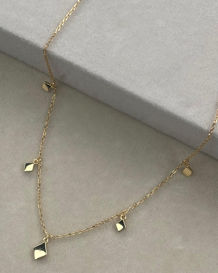 El collar Windsor, es una pieza de diseño minimalista. Elaborada en Plata de ley 925, con un baño de oro de 18 kt, y cinco colgantes en forma de rombo aportando brillo y movimiento.