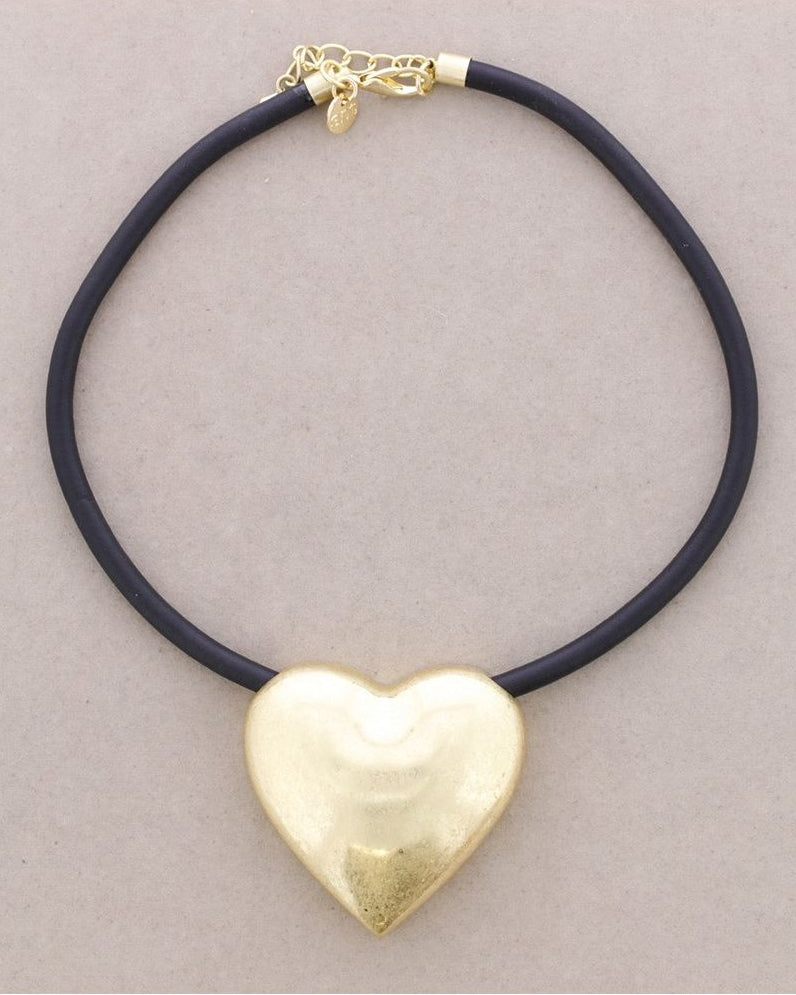 Esta gargantilla combina la sencillez de la cuerda lisa y flexible con un colgante de corazón XL, en dorado. El corazón es la pieza central, aportando un toque romántico y chic a cualquier look.