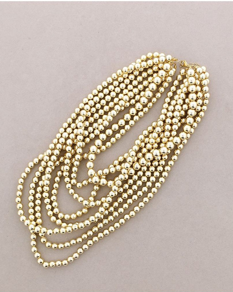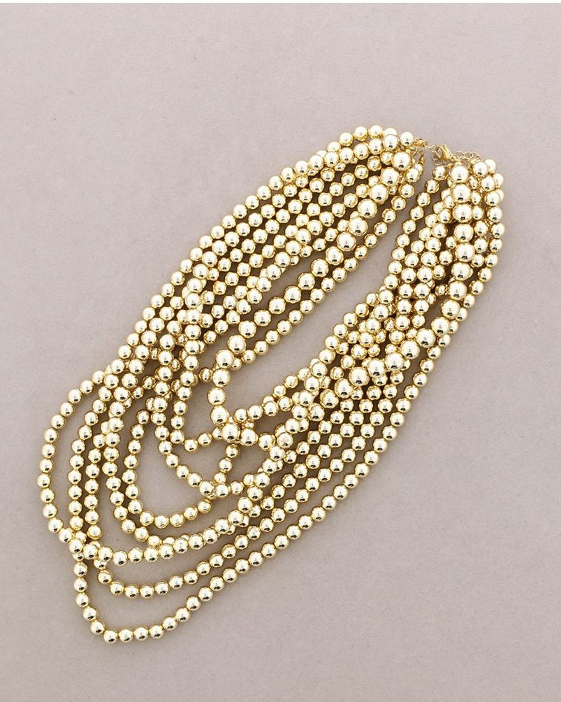Descubre el encanto luminoso del Maxi Collar Aurora, una pieza diseñada para brillar con personalidad propia. Su diseño multicapa, compuesto por delicadas cadenas de bolitas doradas, crea un efecto voluminoso y elegante que ilumina cualquier look al instante.