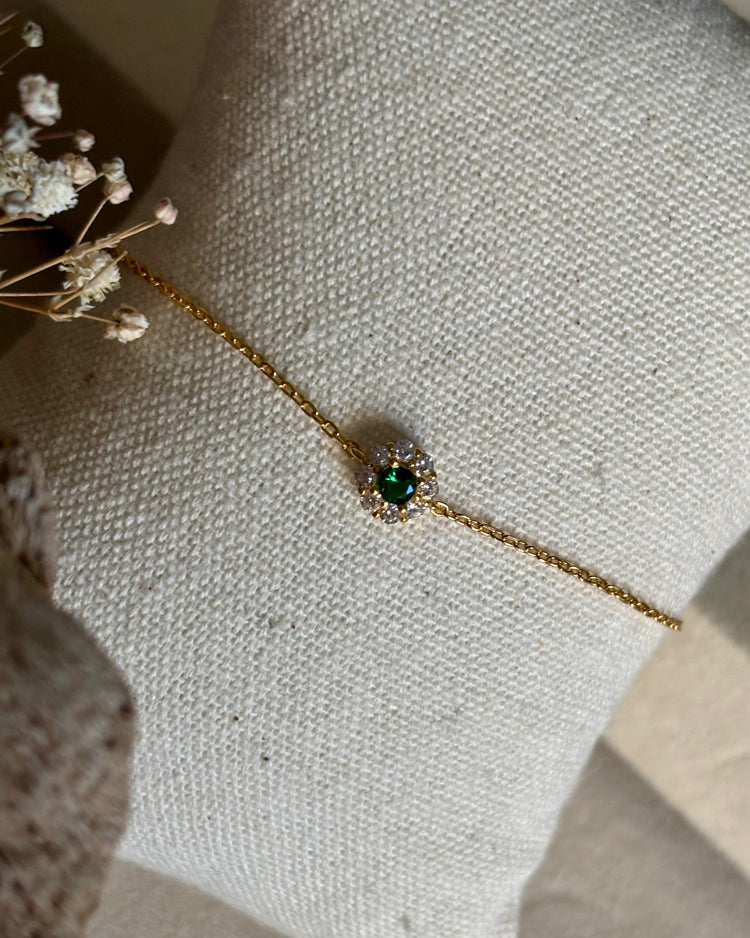 Nuestra pulsera Lady está inspirada en la alta sociedad evocando un estilo refinado. Está elaborado sobre una base de plata de ley 925 con un baño de oro de 18 quilates. Luce una circonita central en color verde esmeralda rodeada a su vez de circonitas en color blanco.